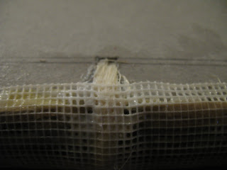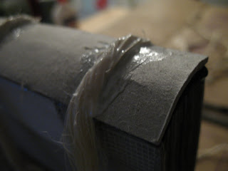 Ensuite j’ai ajouté quelques couches de ma bande à placo, de colle et de carton pour rattraper l’épaisseur des tranchefiles et bien arrondir le dos (larrondissure)