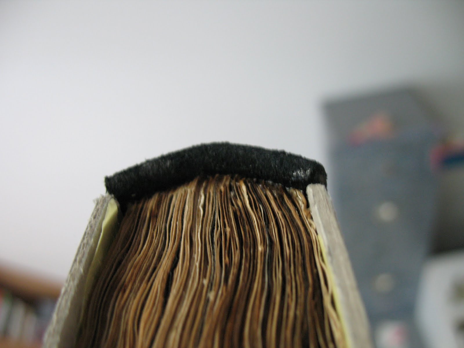 Ensuite on met les tranchefiles. Là toujours le même problème, pas de bras pas de chocolat. NON, c’est pas ça, pas de cahier, pas de couture, et donc pas de tranchefile. La tranchefile est le petit bourlet de tissus situé en tête et queue (aux sommets) de l’ouvrage relié. C’est par là qu’on tire le livre vers soi lorsqu’il est dans un étagère. Elle permet de protéger la couverture et les pages à cet endroit. Rien que chez les artisants français il existe plus de 70 techniques traditionnelles pour broder la tranchefile. Bon moi j’ai pas eu beaucoup de choix, j’ai choisi de la faire en cuir, comme ça pas besoin de la coudre de cahier. Donc on prend une bande de cuir et on la pli en deux autour d’une mince ficelle (théoriquement en papier), ce qui lui donne son aspect de léger bourlet. j’ai pris le pari de plier le cuir à l’envers pour avoir l’aspect un peu velouté et trancher avec le cuir de la couverture. Je suis très content du résultat.