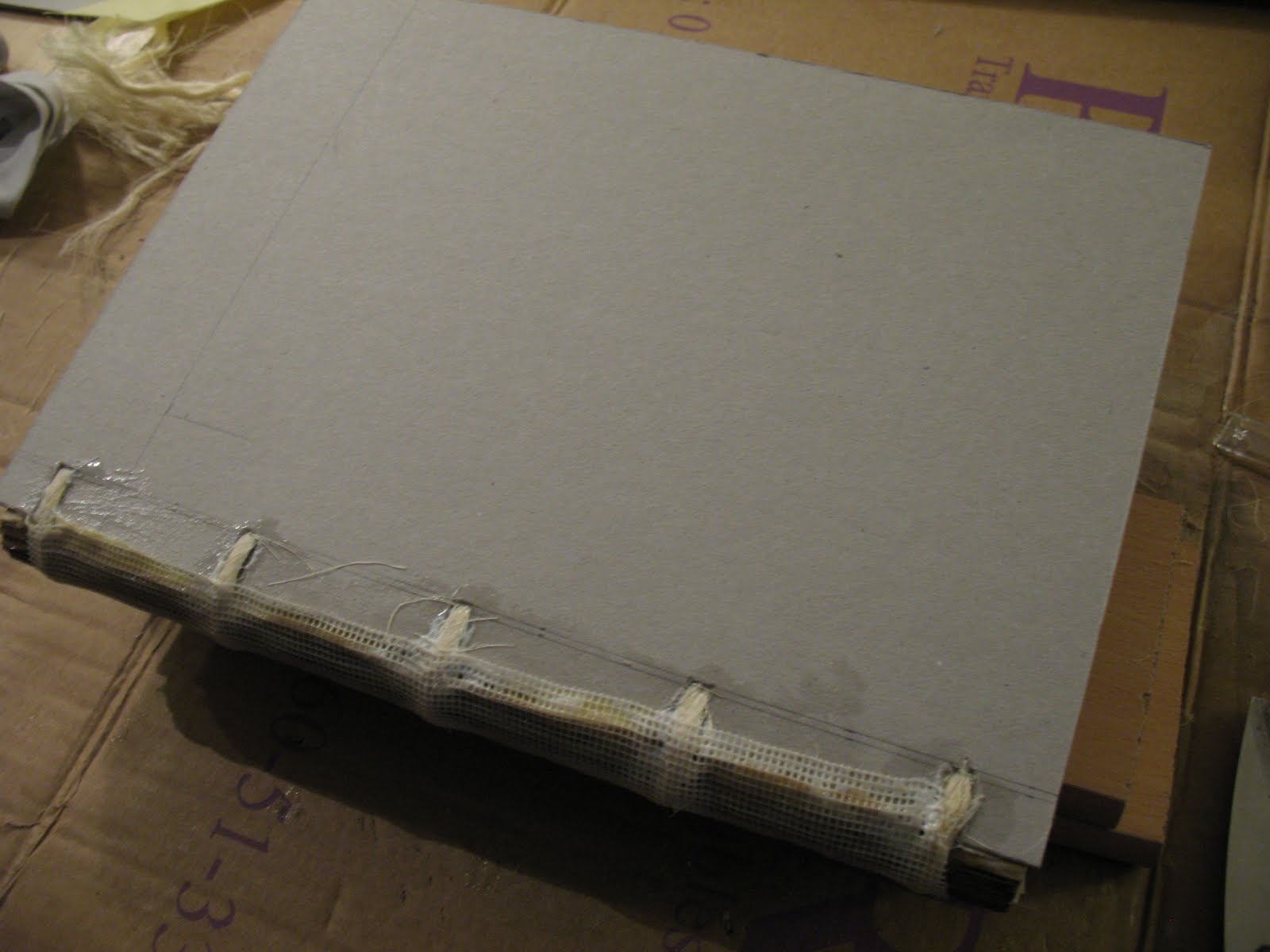 Les plats c’est les deux bouts de cartons rigides qui protègent les pages. Bon là, c’est pas compliqué, on a juste a faire 2 cartons, des trous dedans et passer les ficelles de reliures dans les trous. On coupe la ficelle, on colle ; terminé !