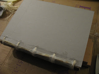 J’ai mis du papier kraft sur l’intérieur des plats pour compenser la future courbure provoquée par le séchage du cuir que je vais bientôt mettre, technique courante.