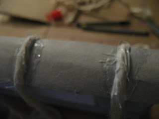 Je dois maintenant parler des nerfs de mon futur grimoire. Les nerfs sont les ficelles qu’on peut voir sur le dos de livres très anciens. Ils forment des bourlets sous le cuir. A l’origine ils étaient en véritables nerfs de boeuf. Par la suite la technique du grecquage permettait de masquer ces supports de couture à l’intérieur du livre et donc de ne plus les voirs sur le dos. Mon grimoire est sensé être très ancien, et donc j’aimerai qu’il ait des nerfs sur le dos. Mais j’ai fait un grecquage. Avec des cahiers ce grecquage ne sert qu’à masquer les nerfs, mais je pense que dans mon cas j’ai eu l’intuition qu’il améliorerai la solidité (je ne saurai jamais si ça marche mais c’est pas grave). Toutes mes bandes a placo ont bien sûr caché mes nerfs. Donc j’en rajoute des faux histoire que ca fasse plus ancien. J’entends dans le fond qu’on me traite de tricheur, oui, mais j’ai le droit.
